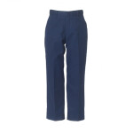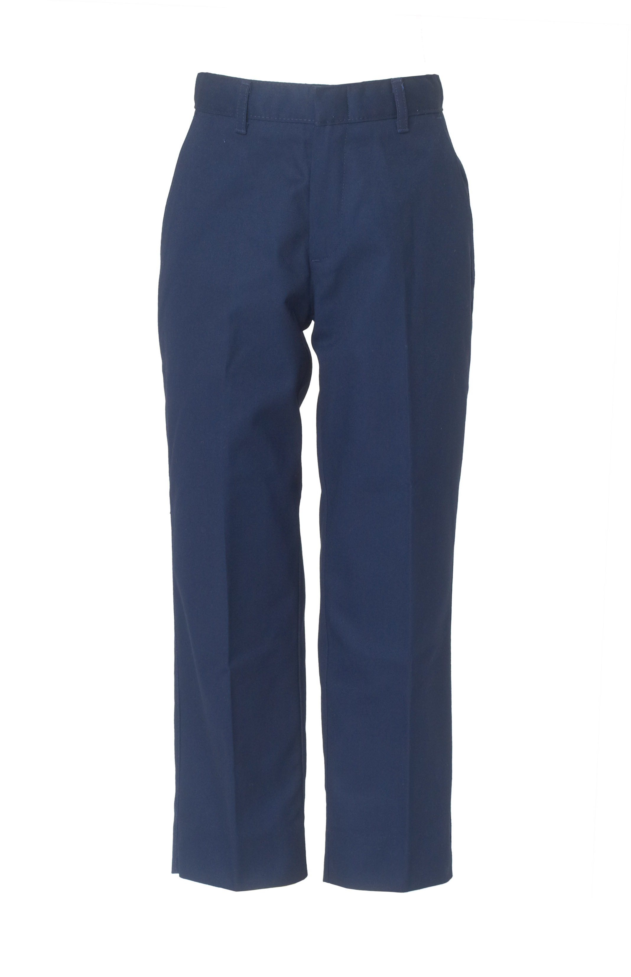 Relaxed fit, plain front pant. Adjustable waistband and double knees in sizes 3-7, 8-16, and husky sizes. Quarter top front pockets, 2 back pockets, hook and eye closure. Wrinkle and stain resistant.